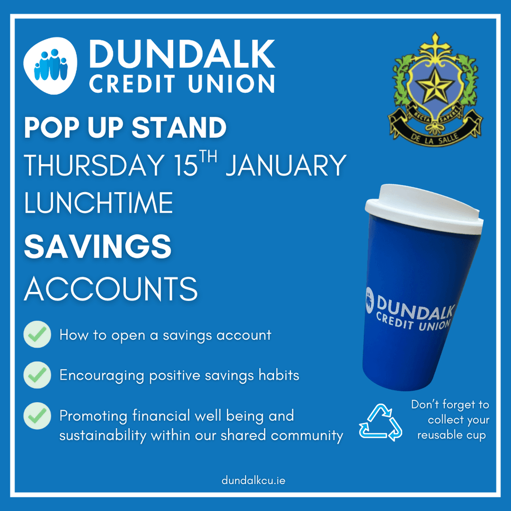 Dundalk Credit Union will visit the school on Thursday 15th January to talk to our students re. saving accounts.