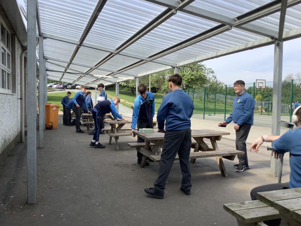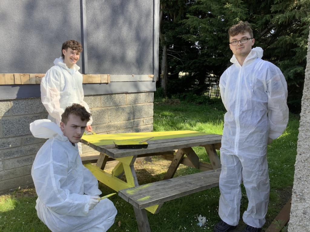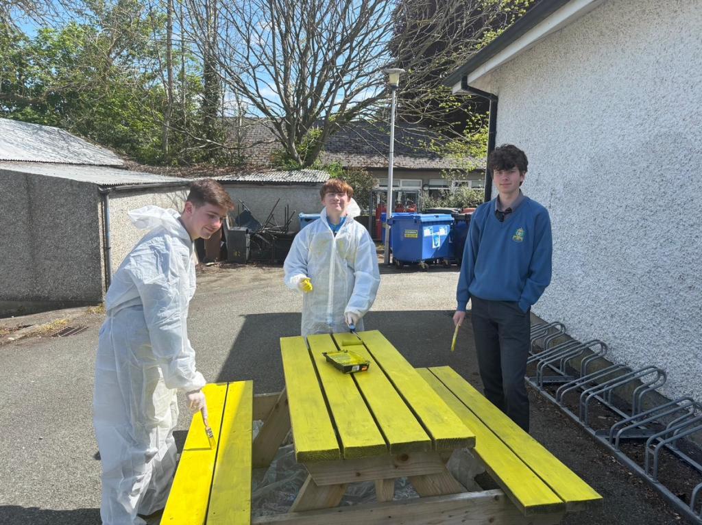 Pictures of Ms Breen’s students across TY, 5th year and 5 LCA enjoying the sunshine while doing great work by getting involved in the school bench sanding and painting project, all thanks to the
