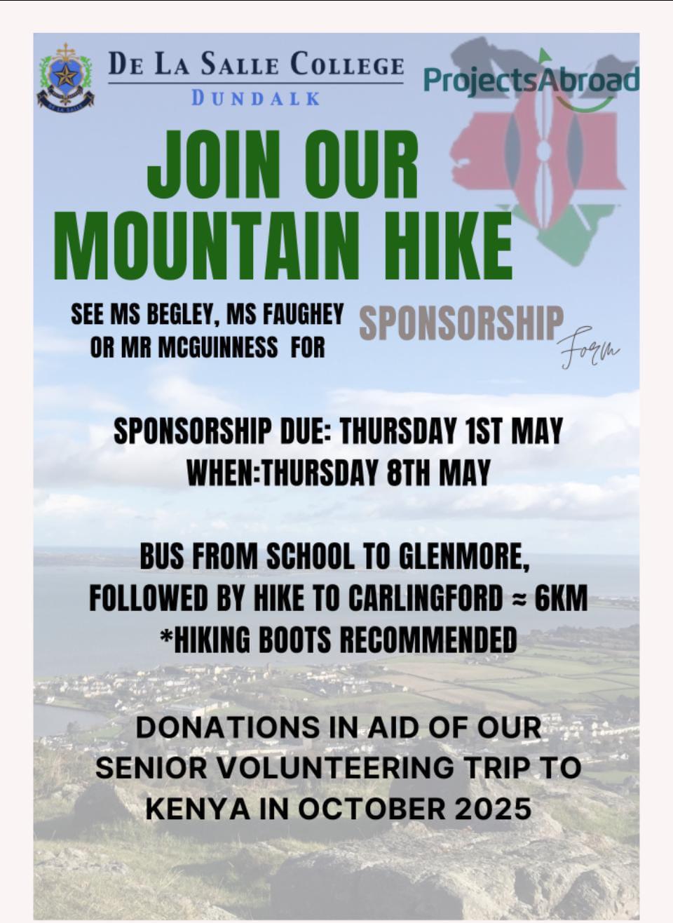 All sponsorship cards and consent forms for our school hike must be returned by Thursday 1st of May.