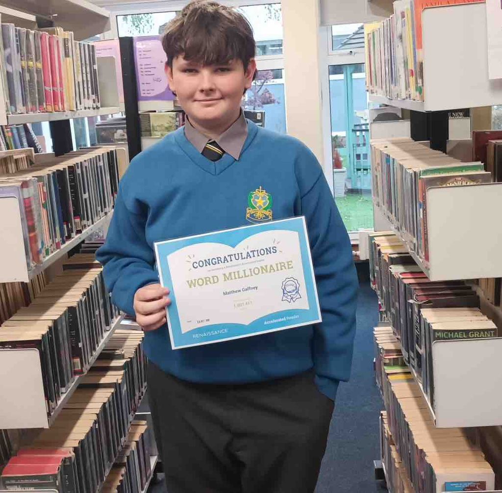Congratulations to Matthew Gaffney , 2nd year on receiving his Accelerated Reader Word Millionaire Certificate. Well done to you both.